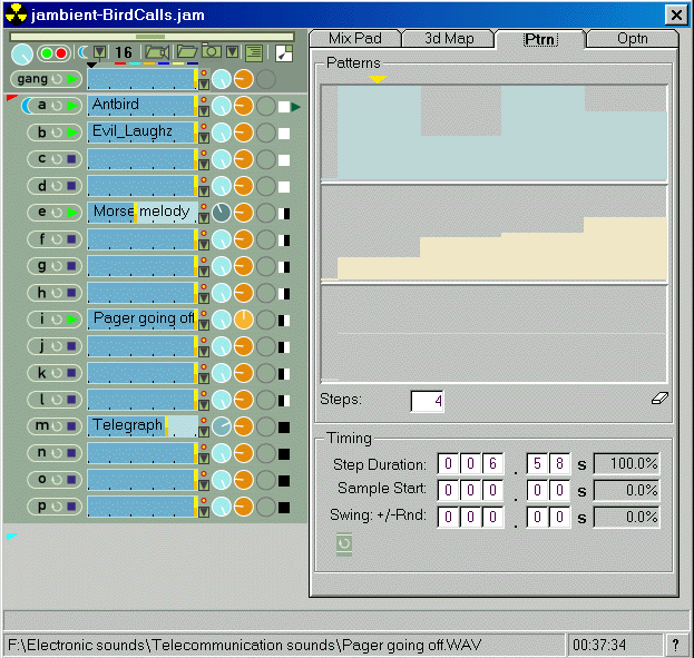 The right hand side shows patterns. Draw volume (blue) and pitch (orange) curves with the mouse, and dial in lengths for steps in the pattern. Allows micro-rythms, programmed to the hundredth of a second!