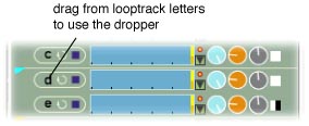 The Dropper lets you copy values between LoopTracks. Drag from a LoopTrack's Letter to turn the cursor into the Dropper, then drop on the control whose value you want to copy. The value at the target is copied into the drag source.