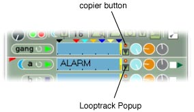 Copy to Clipboard: Drag from the plus sign and drop into a Sample Bin or the Clipboard in the Browser window. All the information about the LoopTrack is stored in the Clipboard, not just the name of the sample(as with History Lists, see below). Drag from the Gang to store all LoopTracks in the Clipboard. You drag LoopTracks back from the Clipboard to the main LoopTrack Panel to go back to stored LoopTracks