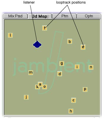 The principle of the 3d Map is very simple. It represents the position of each of your LoopTracks, and of someone who is listening to the LoopTracks. As a LoopTrack moves away from the listener, or vice versa, the sound of the LoopTrack becomes fainter. As the LoopTrack moves to the left of the listener, more and more of its signal is sent through the left stereo channel, etc. So you can change where sounds seem to be coming from by moving either a LoopTrack Position, or the Listener. (Actually, the process of translating the 3d Map into sound is a bit more complicated. See Implementation and Configuration of 3d Sound.) If you are planning to make heavy use of your samples with jambient's 3d feature, you should convert them to mono to improve performance, since DirectSound needs to convert stereo samples back to mono before rendering them in 3d.